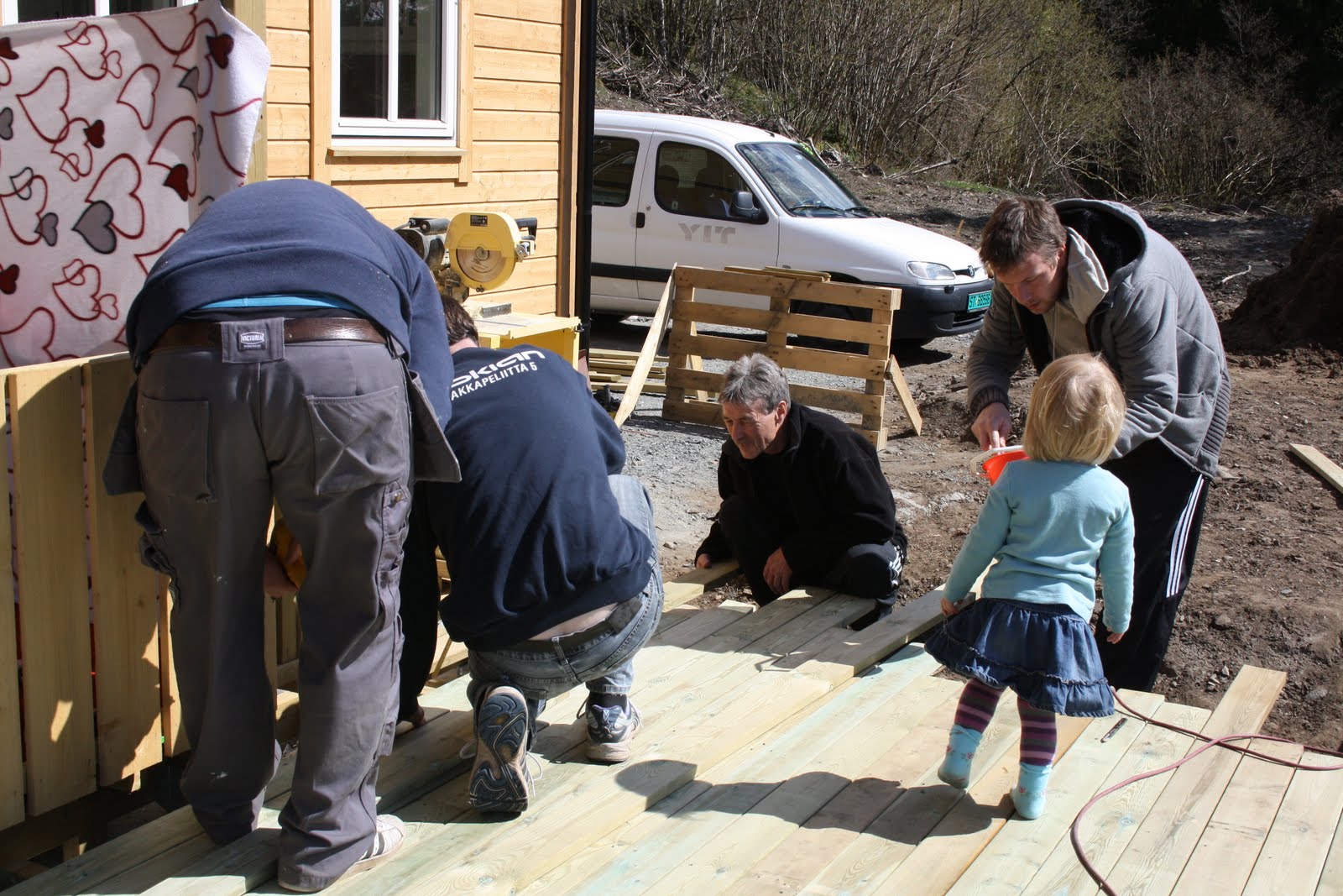 Det er ein flott dag å ha heilagdag på sjølv om ikkje vi har halde den heilag idag. Sola har stått på himmelen og det har faktisk vore så varmt at vi har tatt av oss jakka. Espen med hjelp av Steffen og Jostein har nesten bygd ferdig terrassa. Espen har berre litt igjen så er det ferdig.